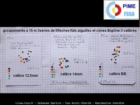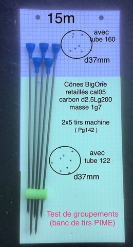 Encore un test réalisé par Pime concernant les cônes Big One recoupés en 0.5 et montés de fut carbone 20 cm :RÉSUMÉ synthétique de test de groupements flèches cônes calibre 05 Big One retaillés fûts carbone